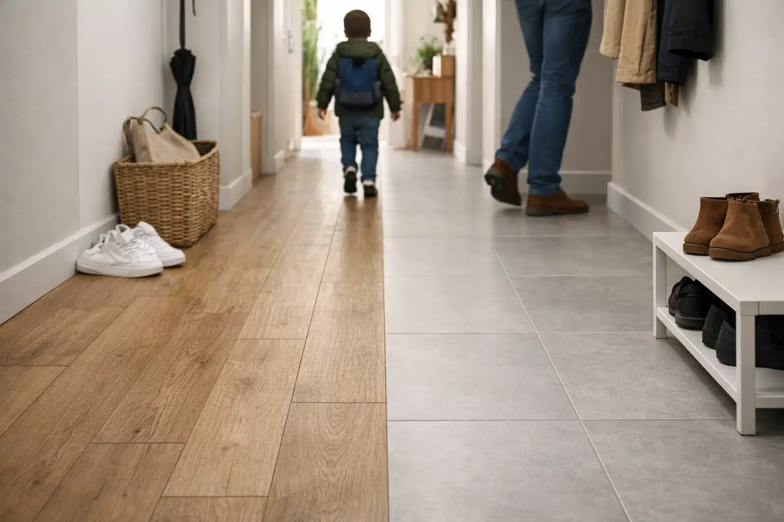 Le confort sous les pieds influence grandement le vécu quotidien d’un couloir. Le carrelage, froid et dur, peut être désagréable pieds nus, particulièrement en hiver. Sa surface rigide fatigue également davantage les articulations lors de stations debout prolongées.